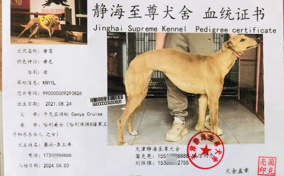 2024年4月20日藁城李玉涛的格力犬种母黄鹰使用藁城闫飞飞的格力犬种公哇塞大圣配种,并于2024年6月产下9条,存活4公3母