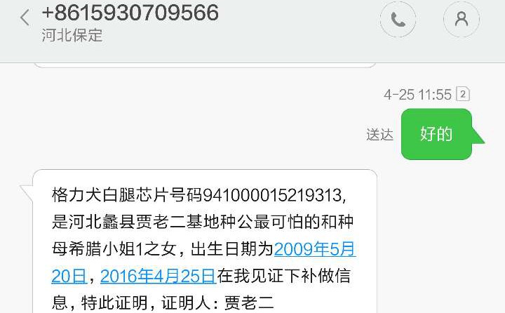 2014年1月22日南乐县石雪林的格力犬种母白腿使用武小犬业的格力犬种公摩甘波人工授精,并于2014年3月产下一窝