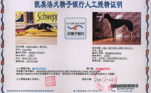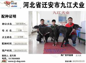 2012年4月11日南乐县石雪林的格力犬种母白腿使用九江犬业的格力犬种公灿烂的背风配种,并于2012年6月产下一窝